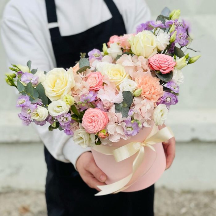 Гортензия – 1 шт.Маттиола – 2 шт.Эвкалипт – 3 шт.Гвоздика – 2 шт.Эустома – 2 шт.Лента атласная – 1 шт.Роза белая – 4 шт.Шляпная коробка – 1 шт.Бомбастик – 3 шт.Оазис флористический – 1 шт.