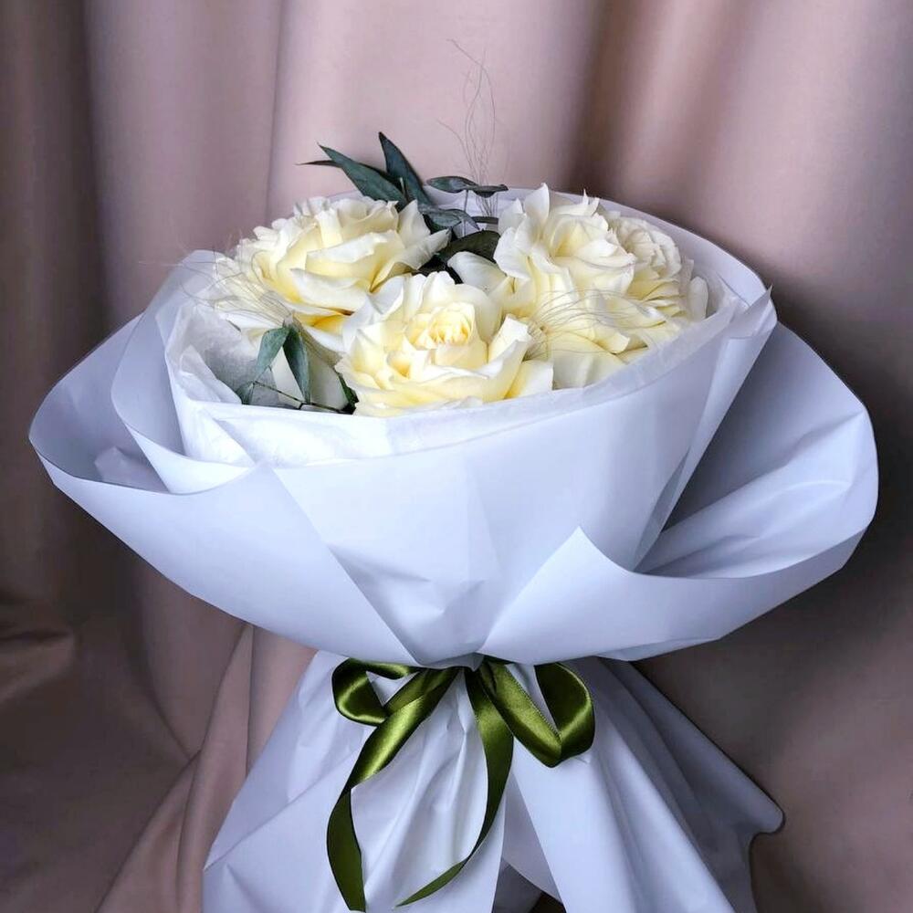 Эвкалипт – 3 шт.Лента атласная – 1 шт.Роза французская – 3 шт.Ковыль – 3 шт.пленка флористическая – 3 шт.подкормка для стойкости цветов – 1 шт.открытка для пожеланий – 1 шт.