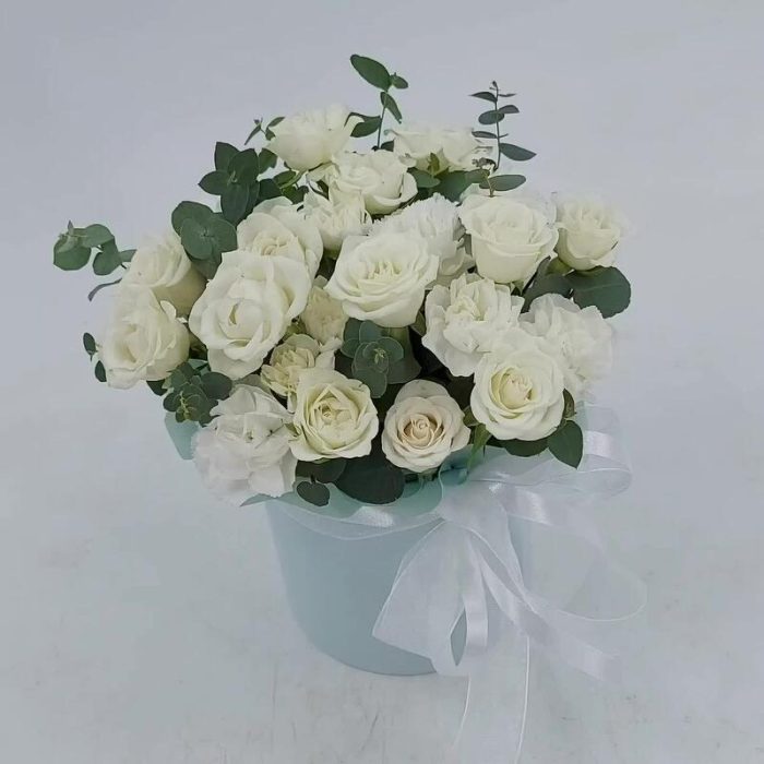 Белые кустовые розочки с эвкалиптом в коробке XS