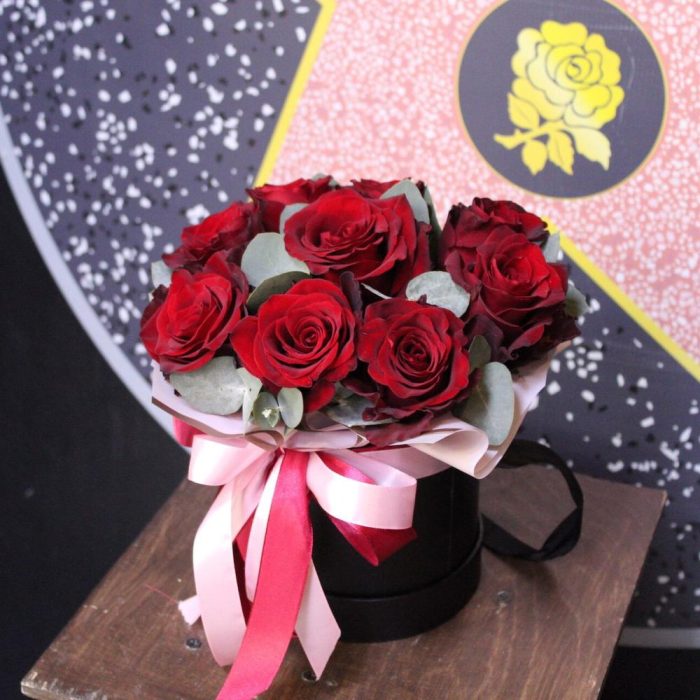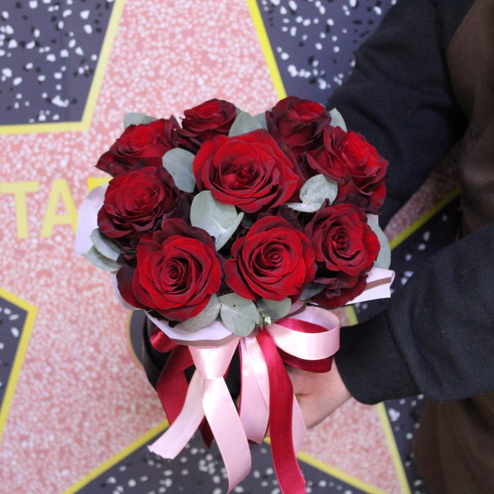 Роза Эксплорер – 9 шт.Эвкалипт – 3 шт.Пленка дизайнерская – 1 шт.Оазис флористический – 1 шт.Коробка шляпная – 1 шт.Лента атласная – 2 шт.