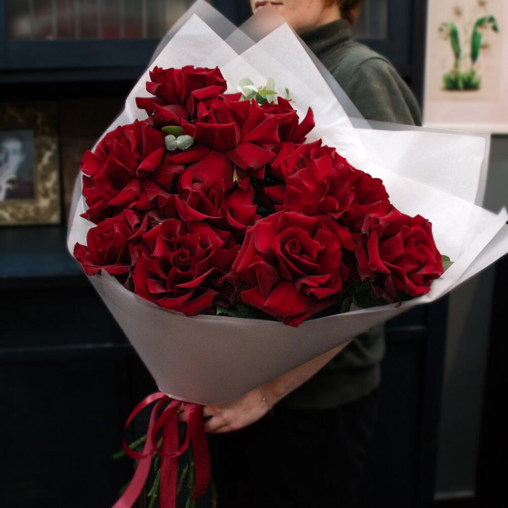 Эвкалипт – 3 шт.Тишью – 2 шт.Атласная лента – 2 шт.Французская роза – 11 шт.Матовая пленка – 2 шт.