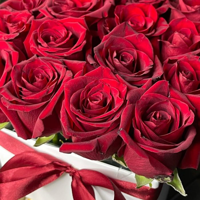 Лента атласная – 1 шт.Роза Эксплорер – 17 шт.Коробка квадратная – 1 шт.Оазис флористический – 1 шт.Клубника в шоколаде – 9 шт.