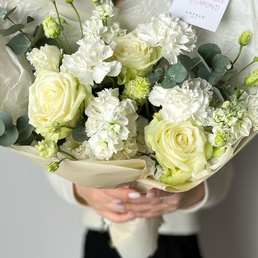 Одноголовая роза – 3 шт.Гвоздика – 3 шт.Эвкалипт – 1 шт.Маттиола – 3 шт.Эустома – 2 шт.Упаковка дизайнерская – 3 шт.Лента атласная – 1 шт.подкормка для срезанных цветов – 1 шт.Открыточка с вашими пожеланиями – 1 шт.
