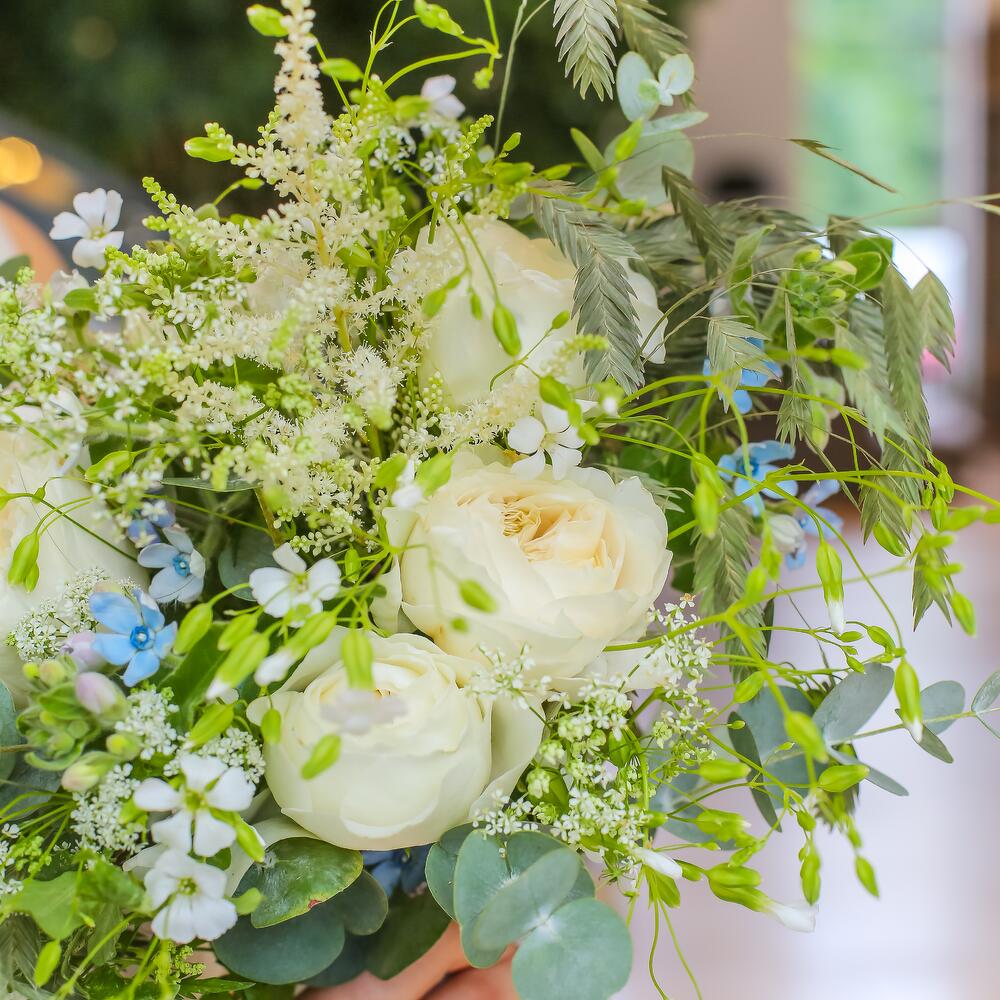 Роза пионовидная – 5 шт.Эвкалипт – 3 шт.оксипетамум голуб – 3 шт.оксипетамум белый – 3 шт.Астильба – 5 шт.Питтоспорум – 3 шт.Трахелиум белый – 5 шт.Зелень – 5 шт.