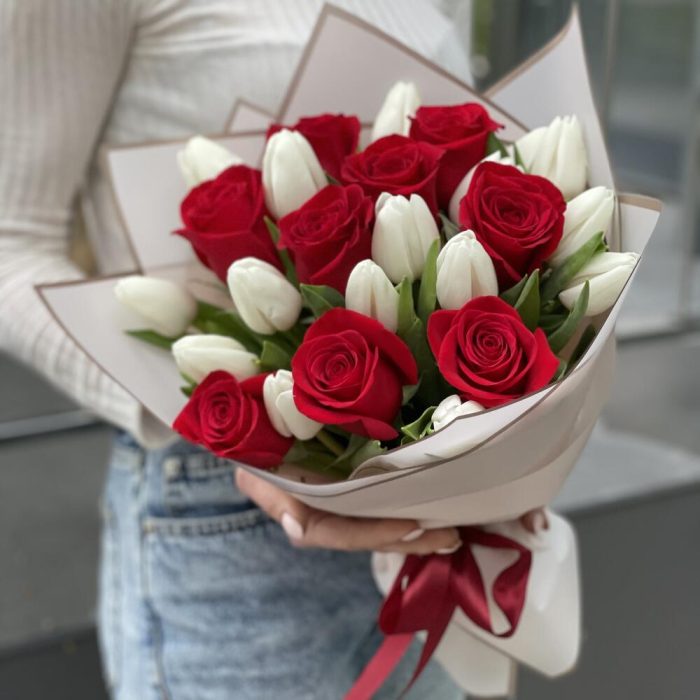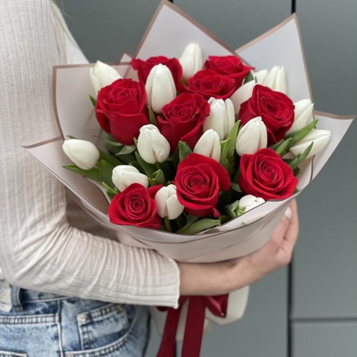 Оформление – 1 шт. Тюльпан белый (голландия) – 16 шт. красная роза сорта фридом – 9 шт.
