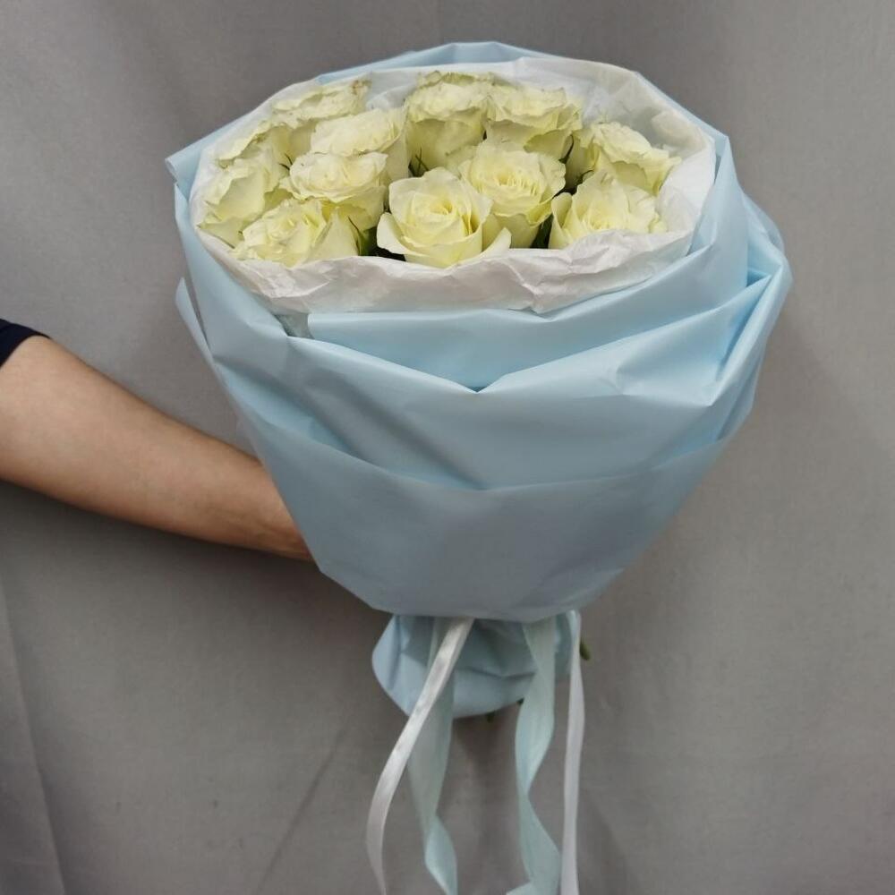 роза кения белая 40 см – 15 шт.Корейская пленка – 1 шт.Тишью белое – 1 шт.Атласная лента – 1 шт.