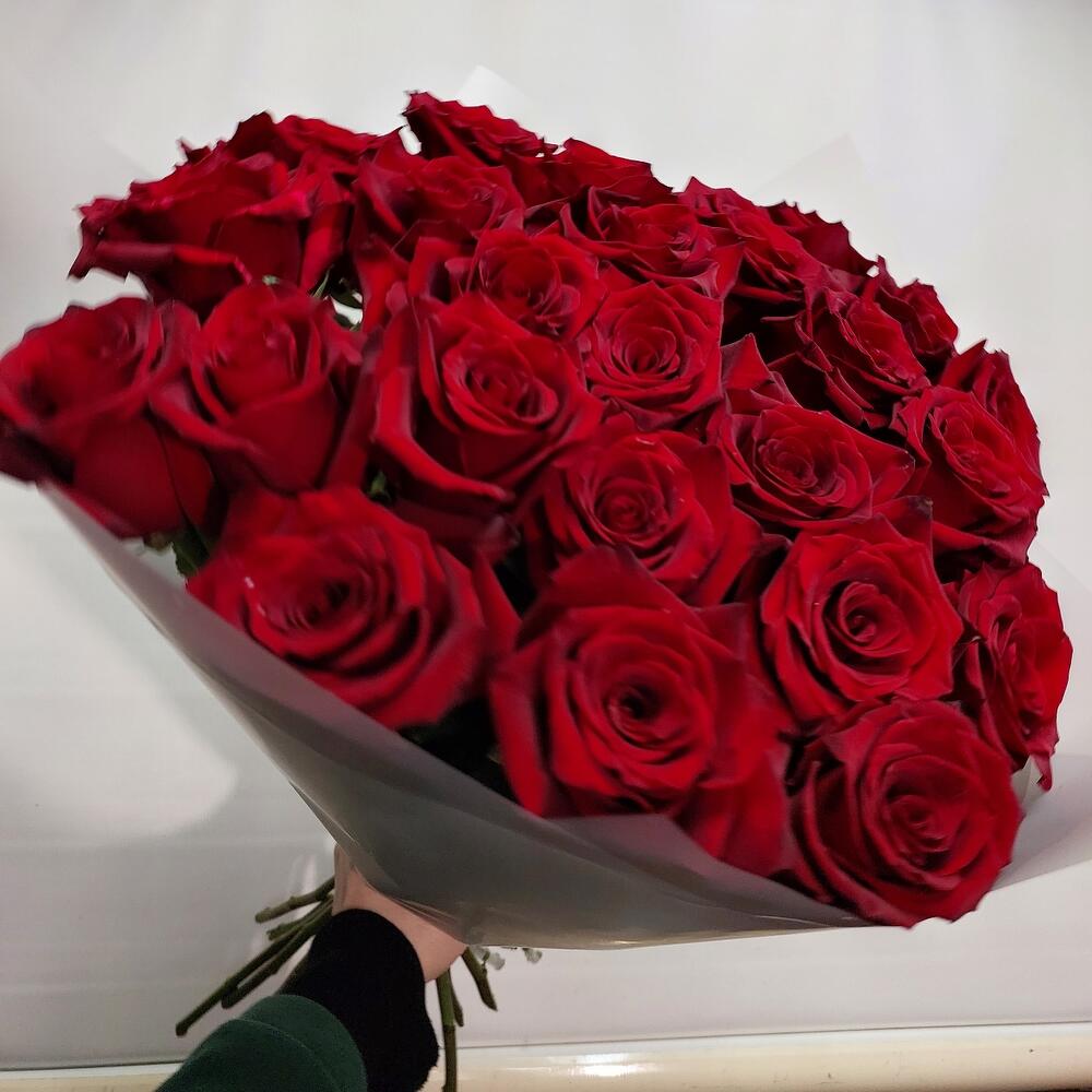 Лента – 1 шт.Упаковка По желанию клиента – 2 шт.роза темно-красная – 25 шт.