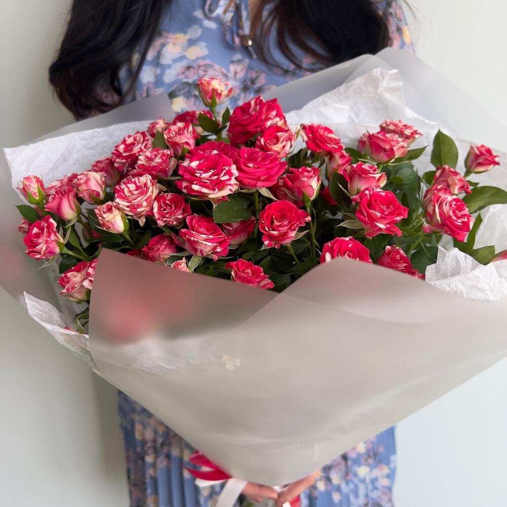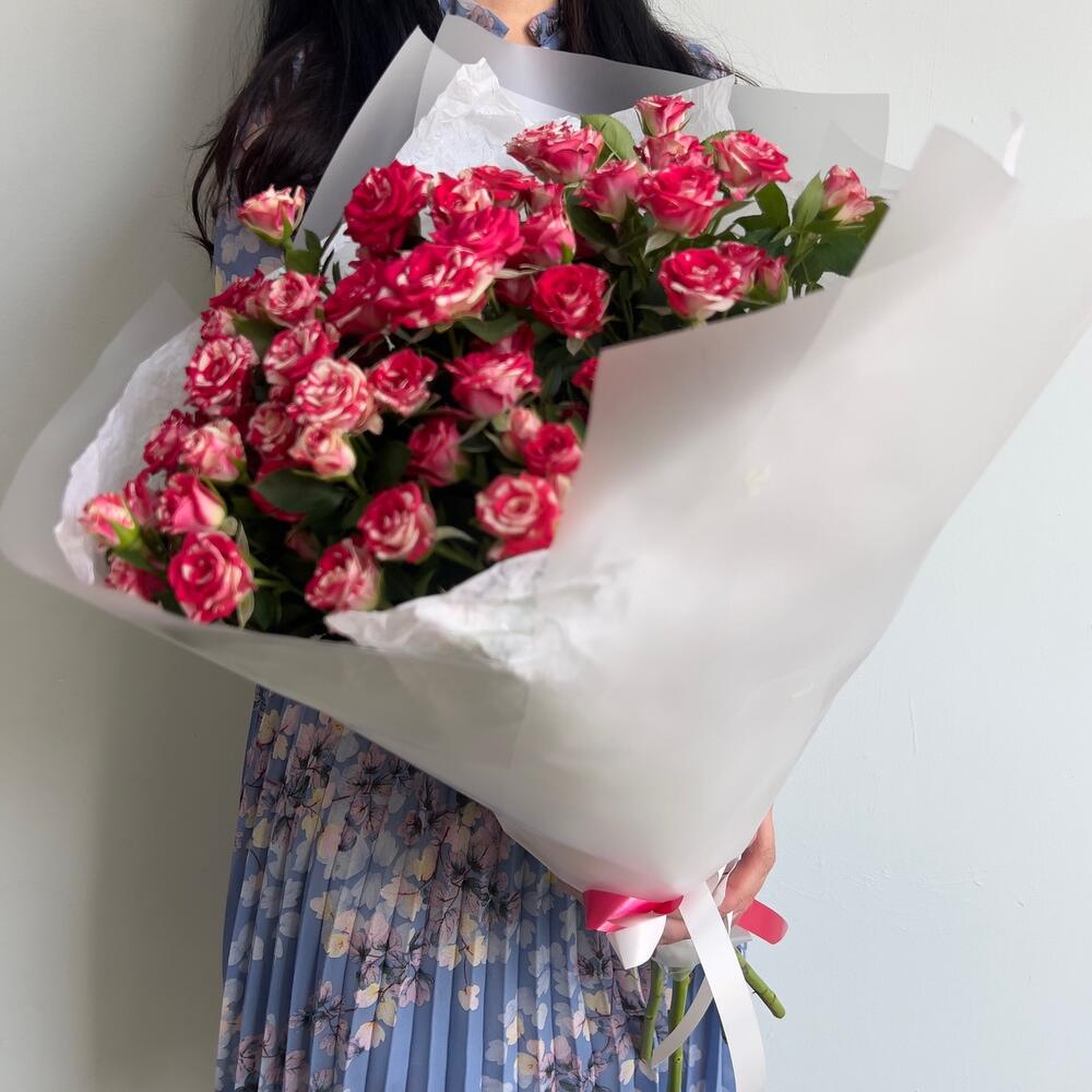 Кустовая роза – 7 шт.Пленка матовая – 2 шт.Тишью белое – 2 шт.Лента атласная – 1 шт.