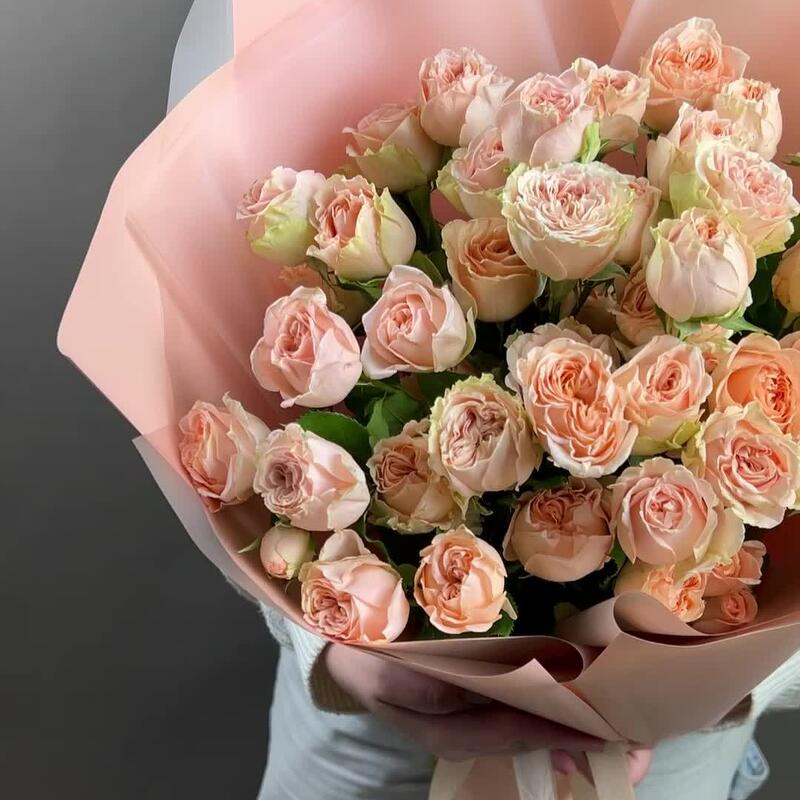 Лента атласная – 2 шт.Роза кустовая пионовидная – 9 шт.Пленка матовая – 5 шт.пленка полупрозрачная матовая – 4 шт.