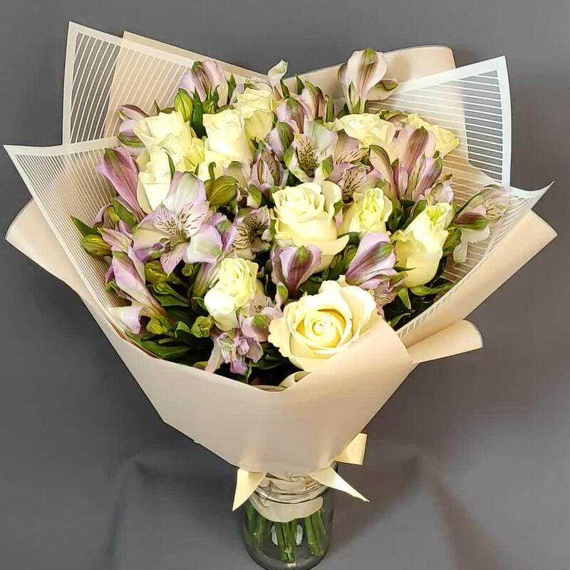 Роза – 11 шт.Альстромерия – 8 шт.Пленка матовая – 3 шт.Лента атласная – 1 шт.