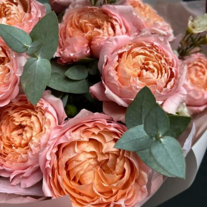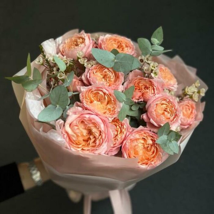 Букет из кустовой пионовидной розы, хамелациум и эвкалипт