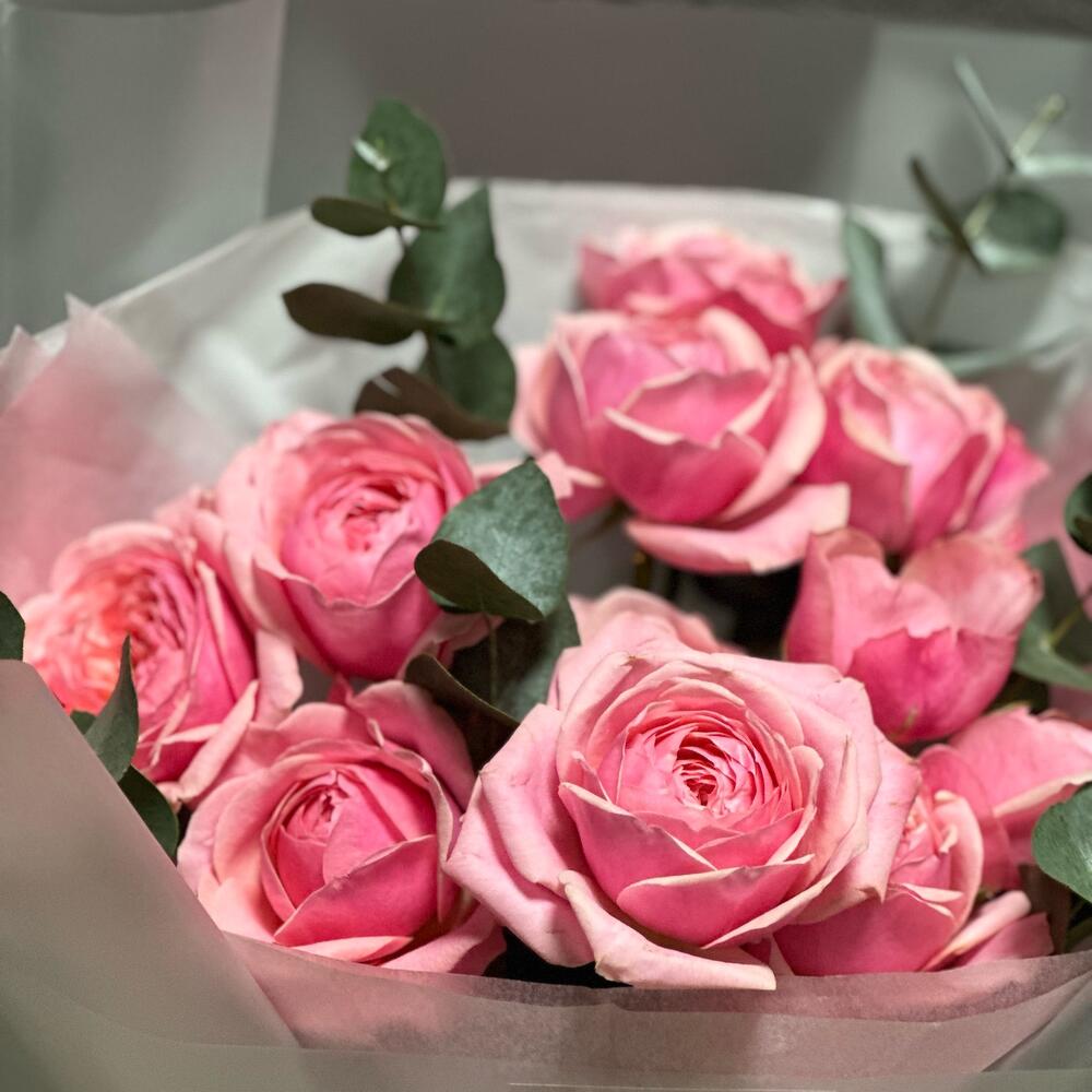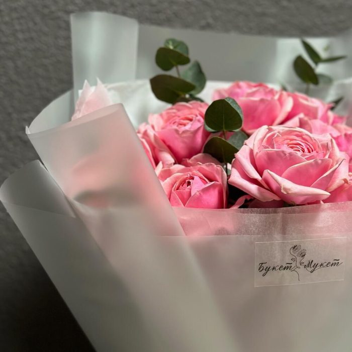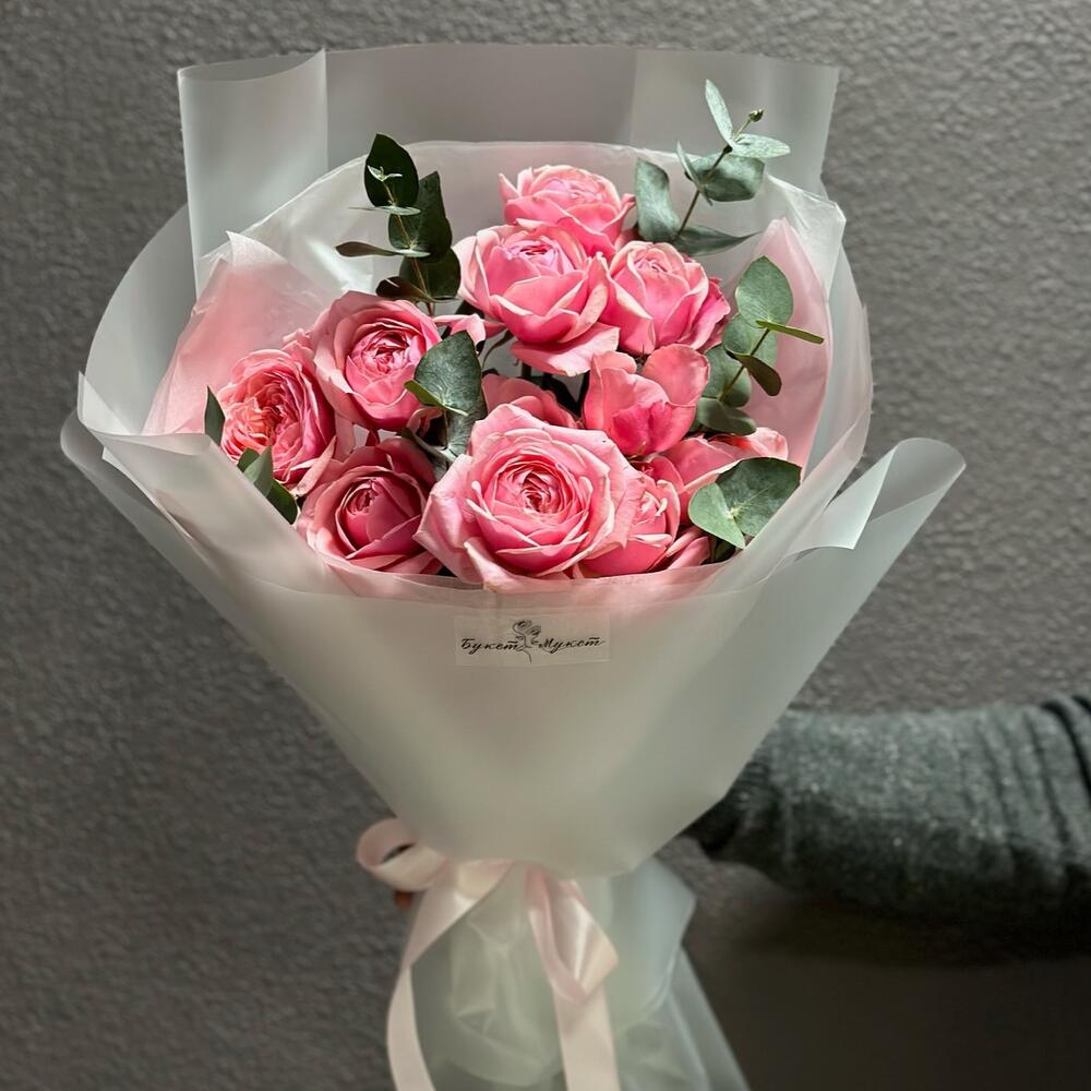 Эвкалипт – 1 шт.Лента атласная – 1 шт.Тишью – 2 шт.Пленка – 2 шт.Роза кустовая пионовидная – 3 шт.