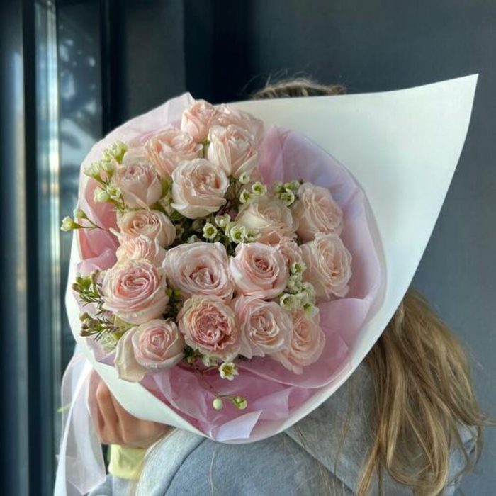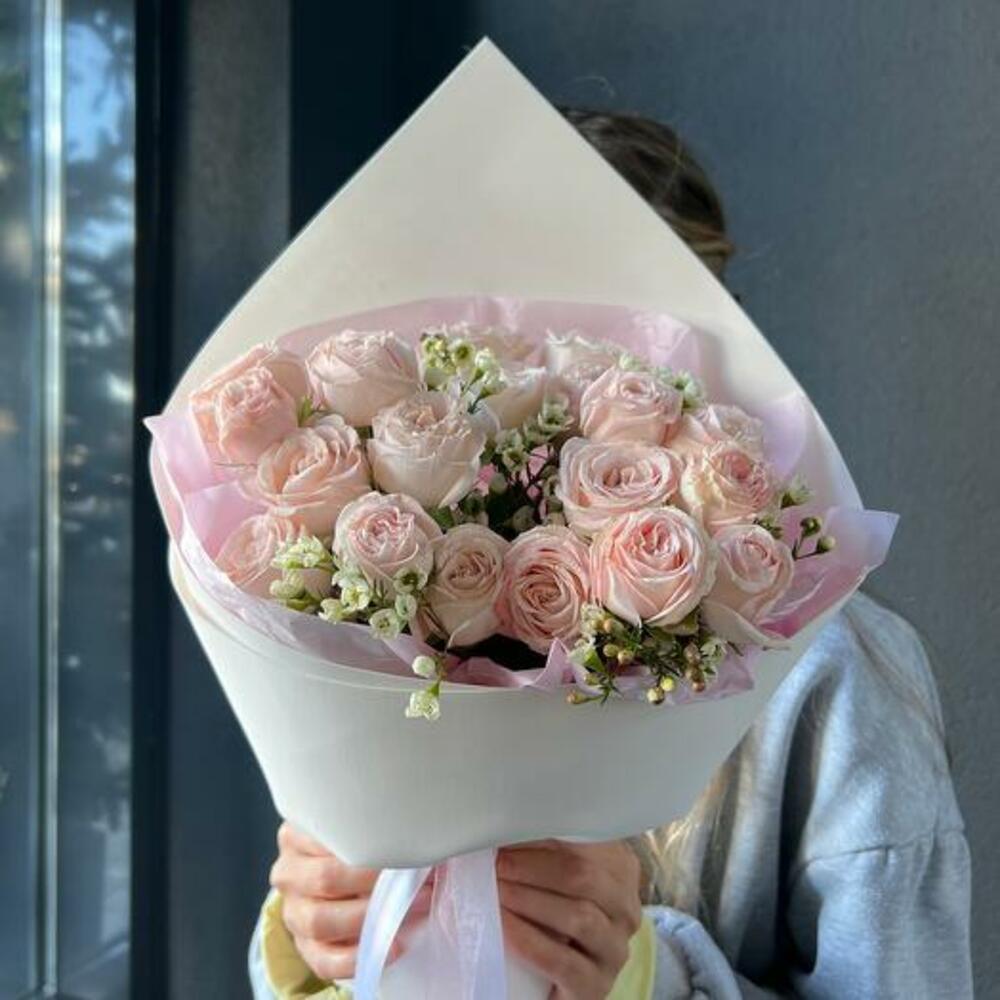 Роза кустовая пионовидная – 5 шт.хаменлациум – 1 шт.Дизайнерская упаковка – 1 шт.Атласная лента – 1 шт.
