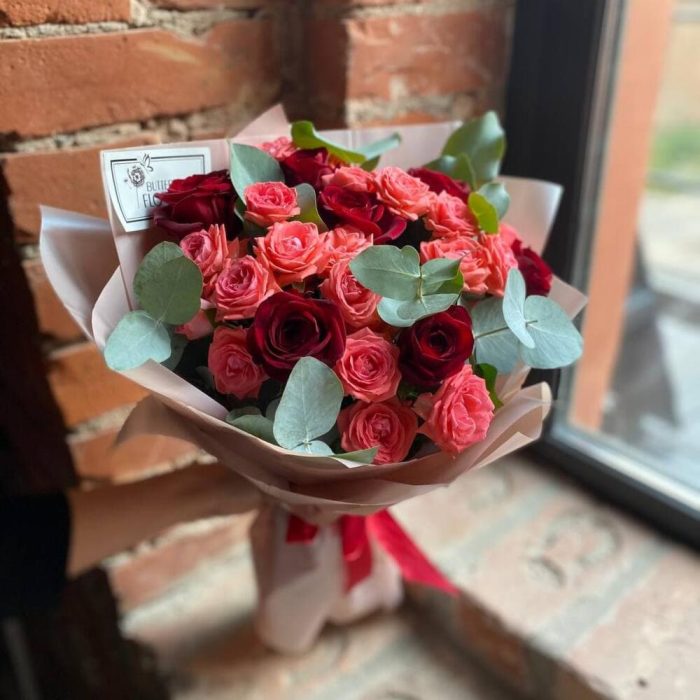 Букет из кустовых и одноголовых роз в красно-розовой гамме “Анна Каренина”