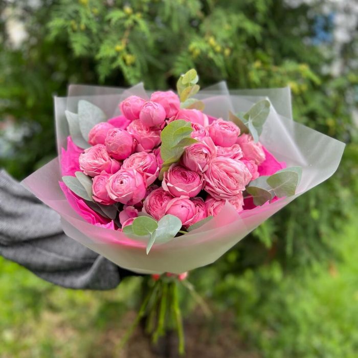 Роза пионовидная – 7 шт.эвкклипт – 3 шт.Тишью – 2 шт.Пленка матовая – 2 шт.