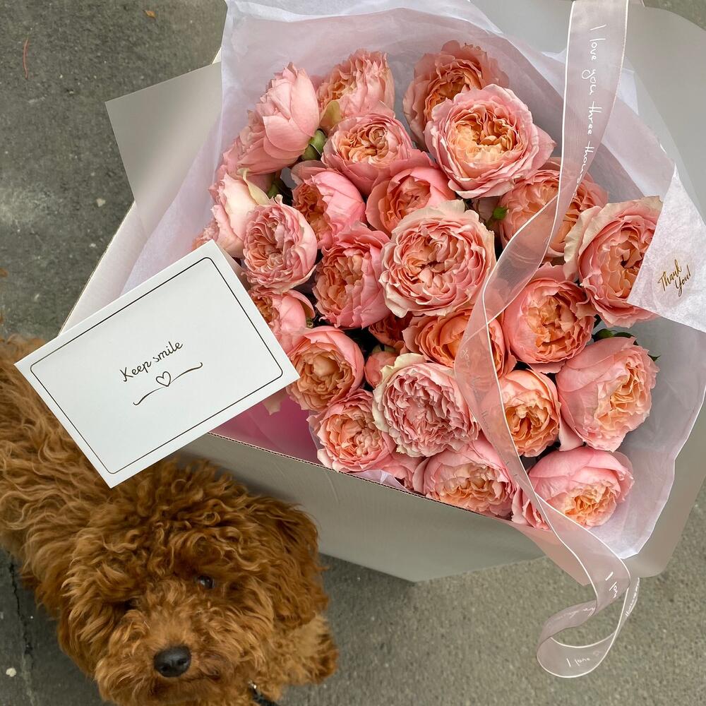 пионовидная кустовая роза джульетта – 7 шт.Упаковка дизайнерская – 1 шт.Транспортировочная коробка – 1 шт.
