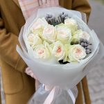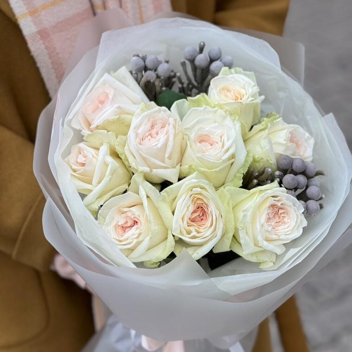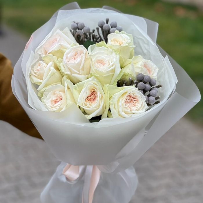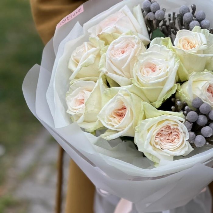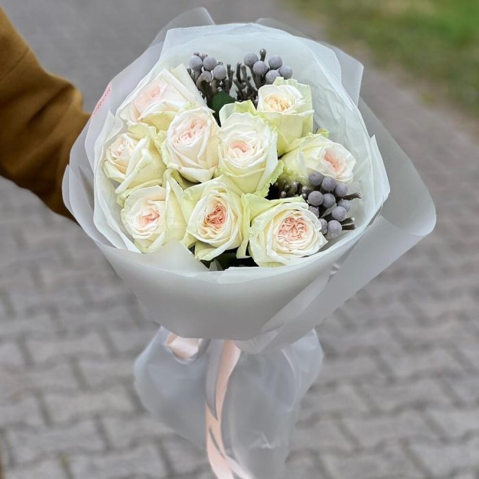 Букет «Арктика»(Роза Ароматная premium О Хара,диантус(гвоздика),эвкалипт )
