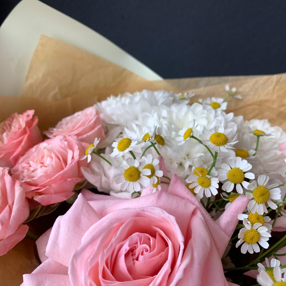 Пионовидная роза – 3 шт.Кустовая пионовидная роза – 1 шт.Кустовая хризантема – 1 шт.Ромашка – 2 шт.антиринум (львиный зев) – 2 шт.декоративная упаковка – 1 шт.Атласная лента – 1 шт.
