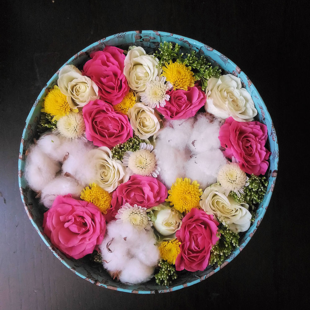 Букет из роз, хризантем и хлопка в декоративной коробке “Сахарная вата”