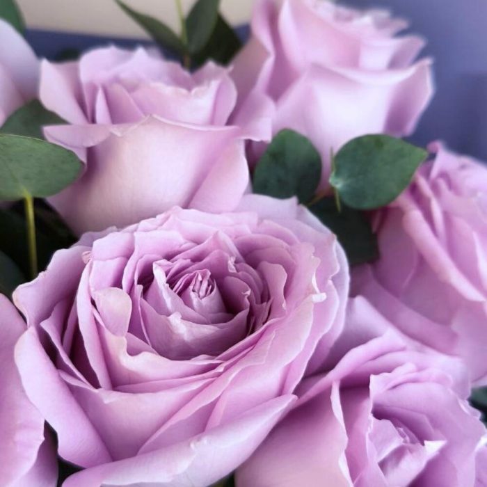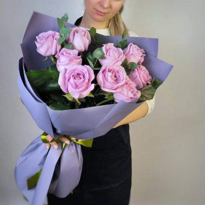 Эвкалипт – 3 шт.Лента атласная – 1 шт.Пленка – 1 шт.Роза маритим – 9 шт.