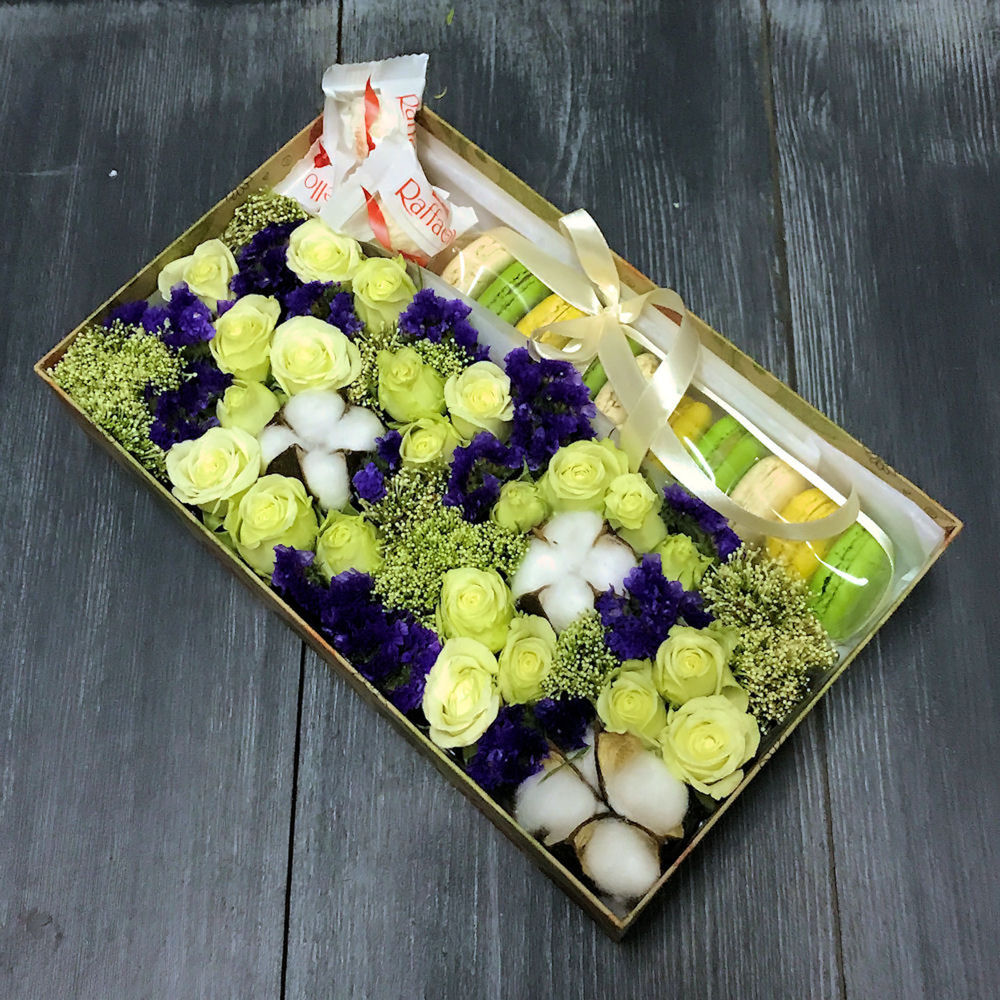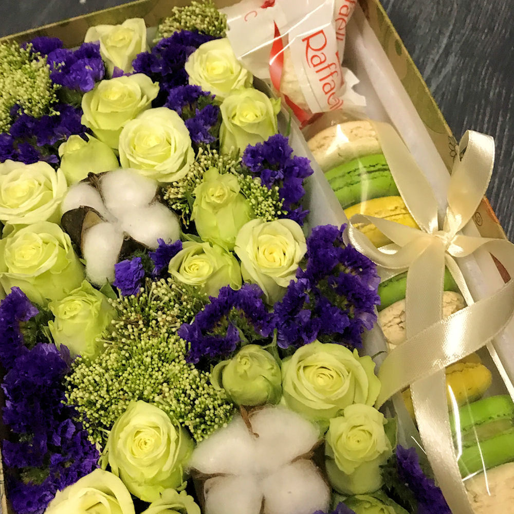 Роза кустовая – 5 шт.Статица – 3 шт.Трахелиум – 3 шт.Хлопок – 3 шт.Раффаэлло – 3 шт.Коробка – 1 шт.Макарон – 10 шт.