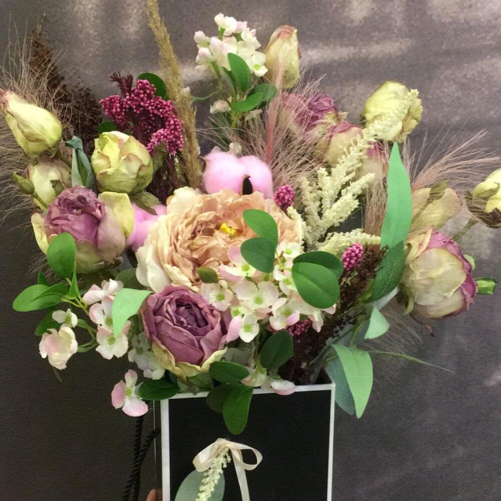 Пионовидная роза – 3 шт.Сухоцветы – 6 шт.хлопок искусственный окрашенный – 2 шт.