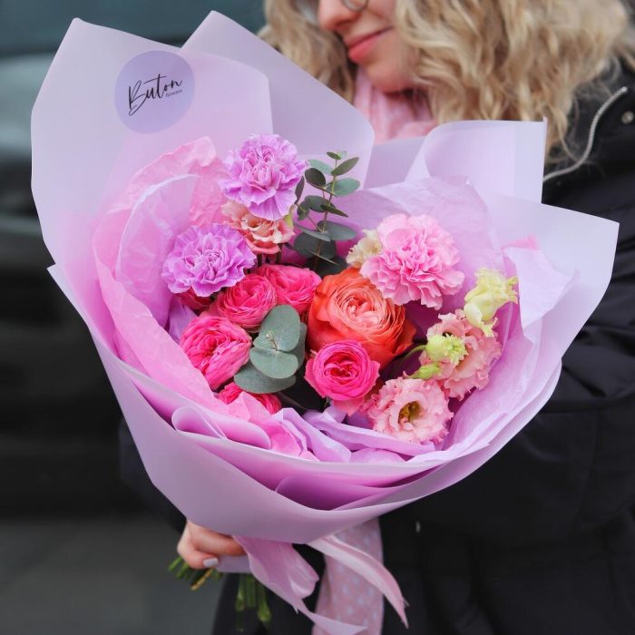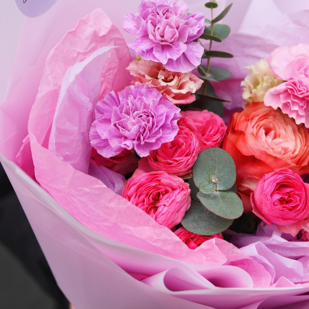 Роза кустовая – 1 шт.Роза кустовая пионовидная – 1 шт.Лизиантус – 1 шт.Гвоздика – 3 шт.Эвкалипт – 1 шт.Открыточка с вашими пожеланиями – 1 шт.Шоколадка – 1 шт.