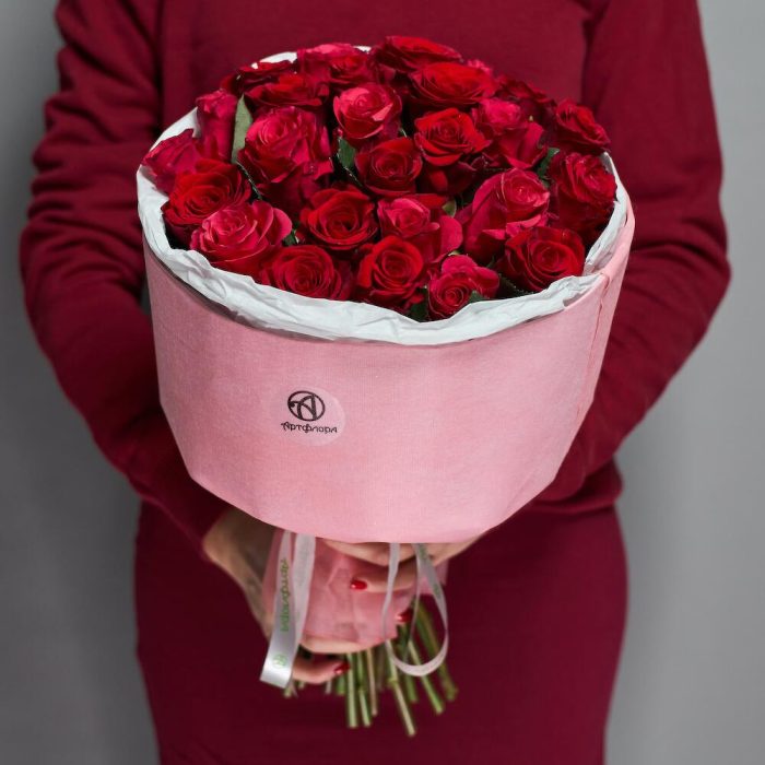 Вывернутые бархатные алые розы в белоснежной упаковке