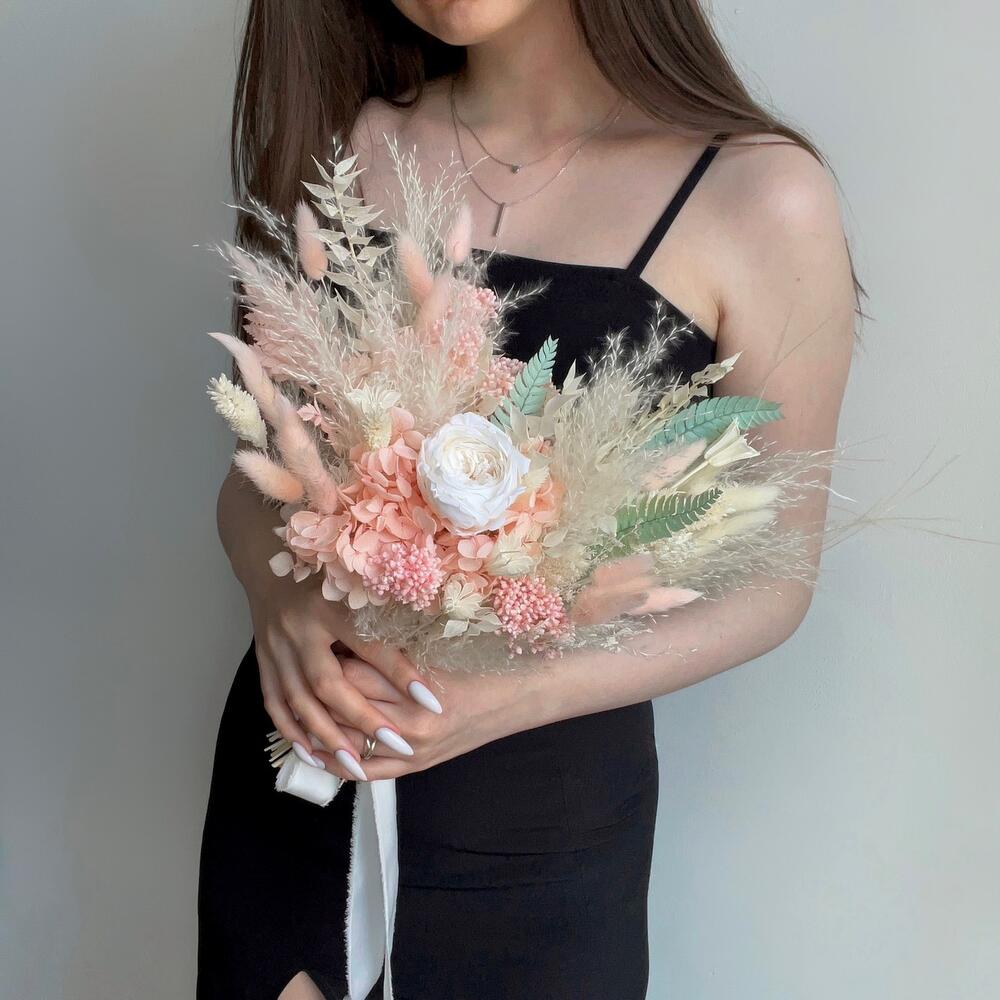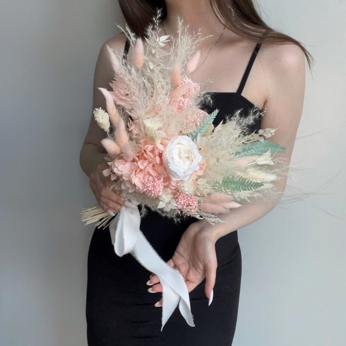 Лента органза – 1 шт.Лента шелк – 1 шт.Роза стабилизированная – 1 шт.гортензия стабилизированная – 1 шт.Лагурус – 14 шт.Нигелла – 1 шт.Озотамнус – 1 шт.пампасная трава – 1 шт.папоротник стабилизированный – 4 шт.Фаларис – 10 шт.Ковыль – 2 шт.Рускус – 3 шт.