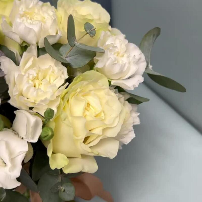 Эвкалипт – 1 шт.гвоздика соломио – 3 шт.Гвоздика – 7 шт.Роза Мондиаль – 5 шт.Лента атласная – 1 шт.