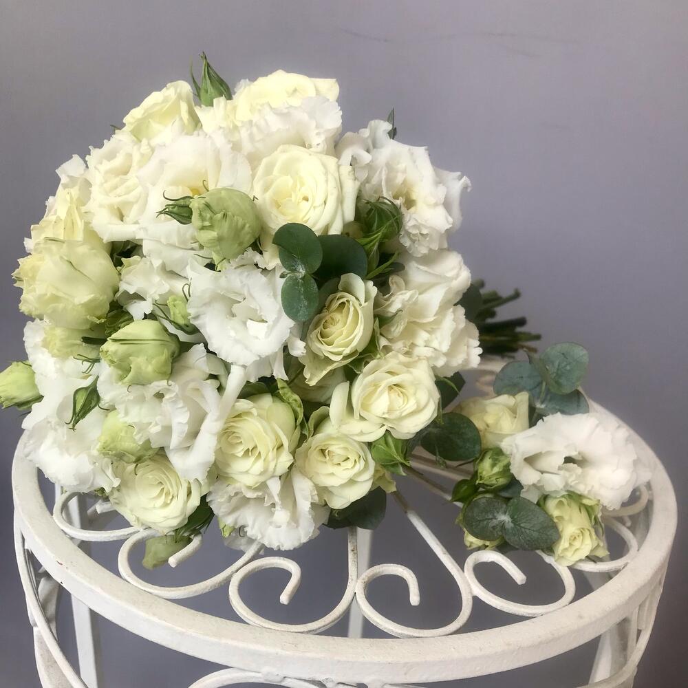 Роза кустовая – 7 шт.эустома белая – 3 шт.Диантус – 7 шт.Писташ – 3 шт.Эвкалипт Baby Blue – 1 шт.Лента атласная – 1 шт.Булавка с бусами – 1 шт.