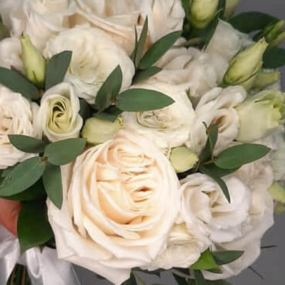 Роза – 7 шт.Зелень – 7 шт.Лизиантус – 8 шт.Лента атласная – 4 шт.