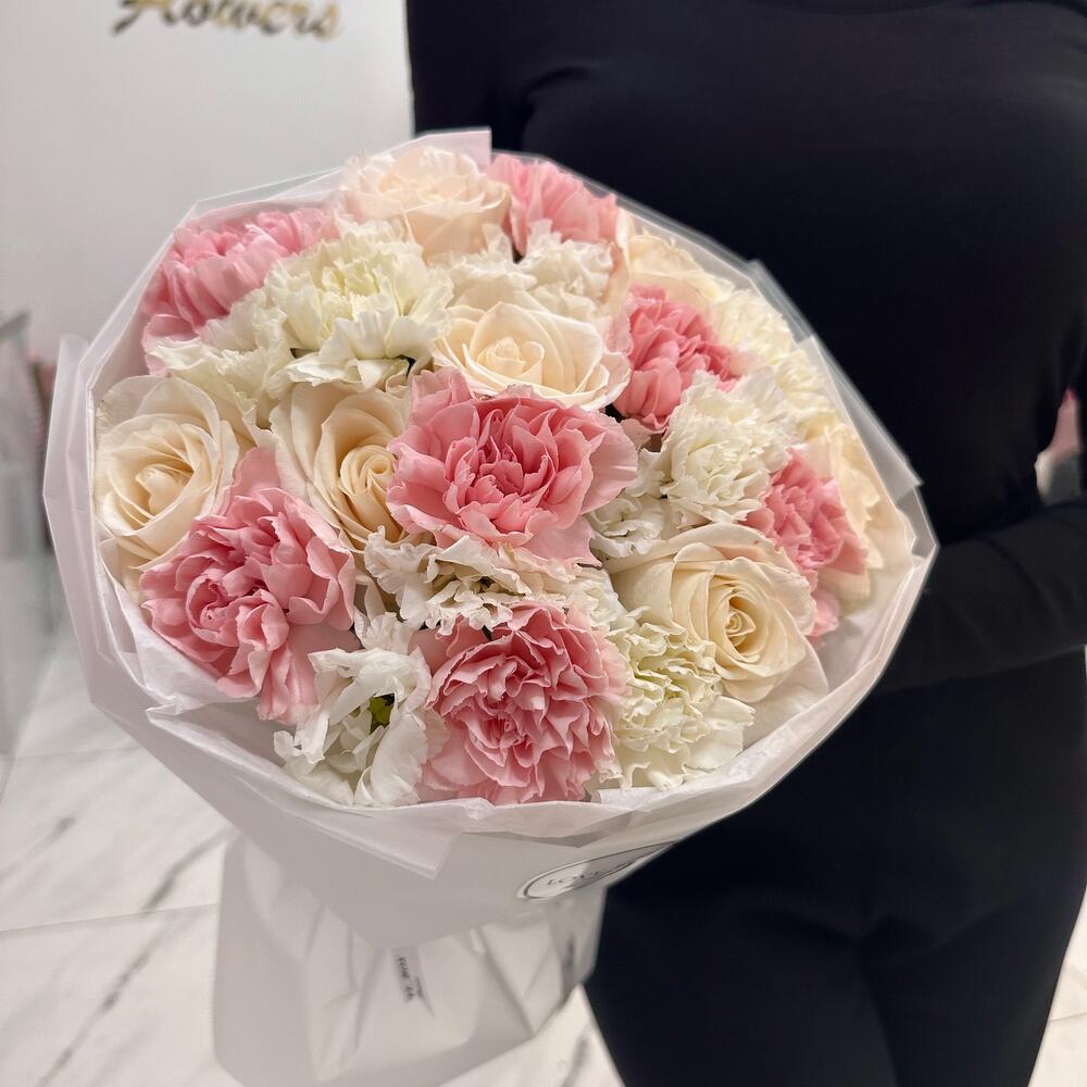 Категории: Гвоздики, Лизиантусы, Розы