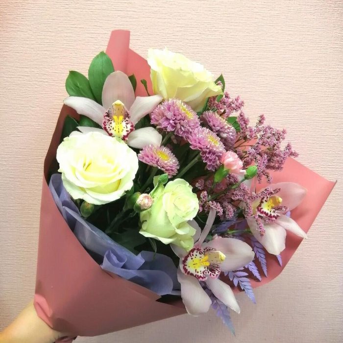 Лента – 1 шт.Лимониум – 2 шт.Папоротник – 1 шт.Хризантема кустовая – 1 шт.Роза Эквадор – 3 шт.Гвоздика – 2 шт.Упаковка дизайнерская – 1 шт.Рускус сочи – 4 шт.Орхидея цветок – 3 шт.
