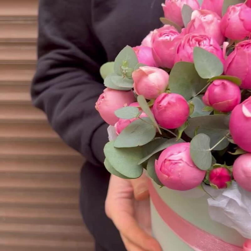 Эвкалипт – 10 шт.Лента атласная – 3 шт.Тишью – 1 шт.Коробка шляпная – 1 шт.Оазис флористический – 1 шт.сильвия пинк пионовидная кустовая роза – 11 шт.