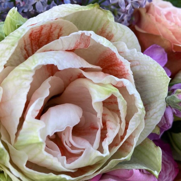 амариллисы – 3 шт.Роза пионовидная – 13 шт.Маттиола – 15 шт.Сирень – 5 шт.Вибурнум – 3 шт.Лента – 1 шт.