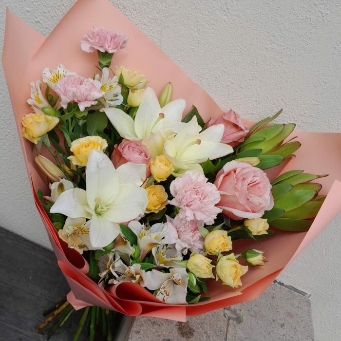Категорий: Альстромерии, Гвоздики, Кустовые розы, Лилии, Пионовидные розы, Розы