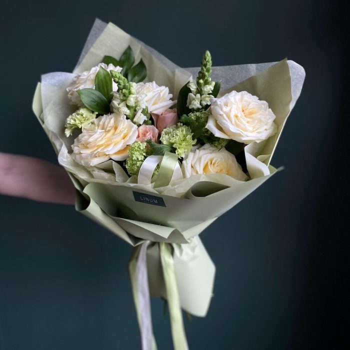 кендилайт – 5 шт.Вибурнум – 1 шт.Рускус – 3 шт.антиринум – 3 шт.Гвоздика – 3 шт.Упаковка дизайнерская – 1 шт.уходовое средство для цветов – 1 шт.транспортировочная упаковка – 1 шт.роза кустовая шиммер – 3 шт.