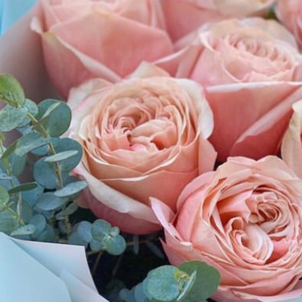 Эвкалипт – 2 шт.Лента атласная – 1 шт.Роза пионовидная – 7 шт.Упаковка дизайнерская – 1 шт.