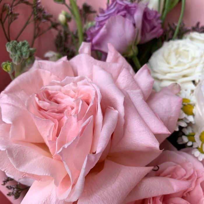 Лизиантус – 2 шт.Лимониум – 2 шт.Маттиола – 2 шт.Пион – 1 шт.Тюльпан – 3 шт.Кустовая роза – 1 шт.Пионовидная роза – 3 шт.декоративная упаковка – 1 шт.Атласная лента – 1 шт.