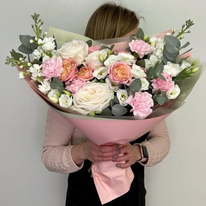 Лизиантус – 2 шт.Маттиола – 3 шт.Эвкалипт – 3 шт.Роза Эквадор – 3 шт.Диантус – 5 шт.Фисташка – 3 шт.Упаковка дизайнерская – 3 шт.роза пионовидная кустовая джульетта – 2 шт.