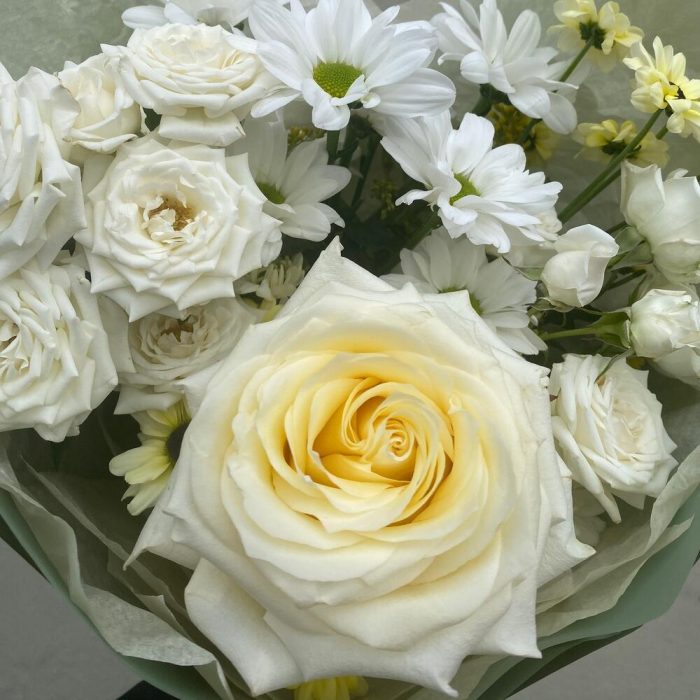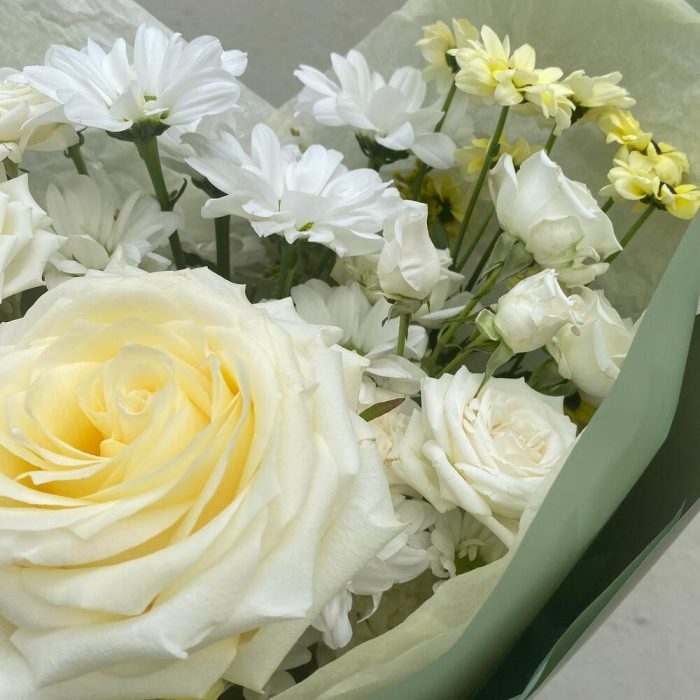 роза сорта кендилайт – 1 шт.Хризантема кустовая – 1 шт.Роза кустовая белая – 2 шт.Хризантема Сантини – 2 шт.