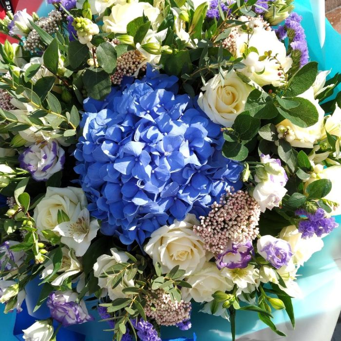 Гортензия синяя – 1 шт.Озотамнус – 7 шт.Роза – 15 шт.Статица – 5 шт.Лизиантус – 7 шт.Альстромерия – 7 шт.Эвкалипт – 3 шт.Зелень – 1 шт.Упаковка дизайнерская – 1 шт.Лента атласная – 1 шт.