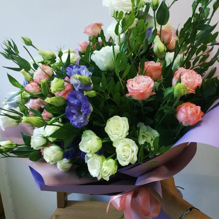 Кустовая роза – 7 шт. эустома белая – 5 шт. эустома синяя – 5 шт. Фисташка – 5 шт. Упаковка дизайнерская – 5 шт. Лента атласная – 1 шт. Пакет подарочный – 1 шт.