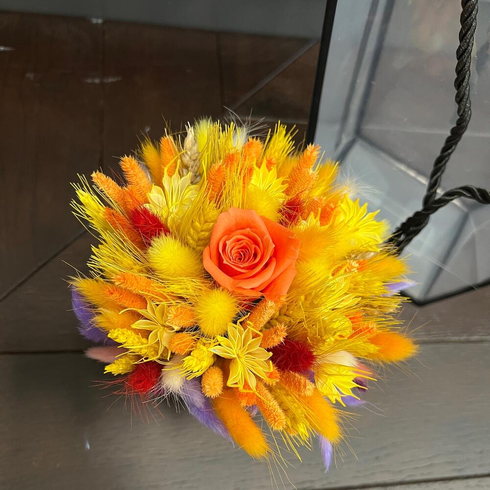 Роза стабилизированная – 1 шт.Лагурус (сухоцвет) – 50 гр.Флум – 5 гр.Пшеница (сухоцвет) – 30 гр.Нигелла сухоцвет – 10 гр.