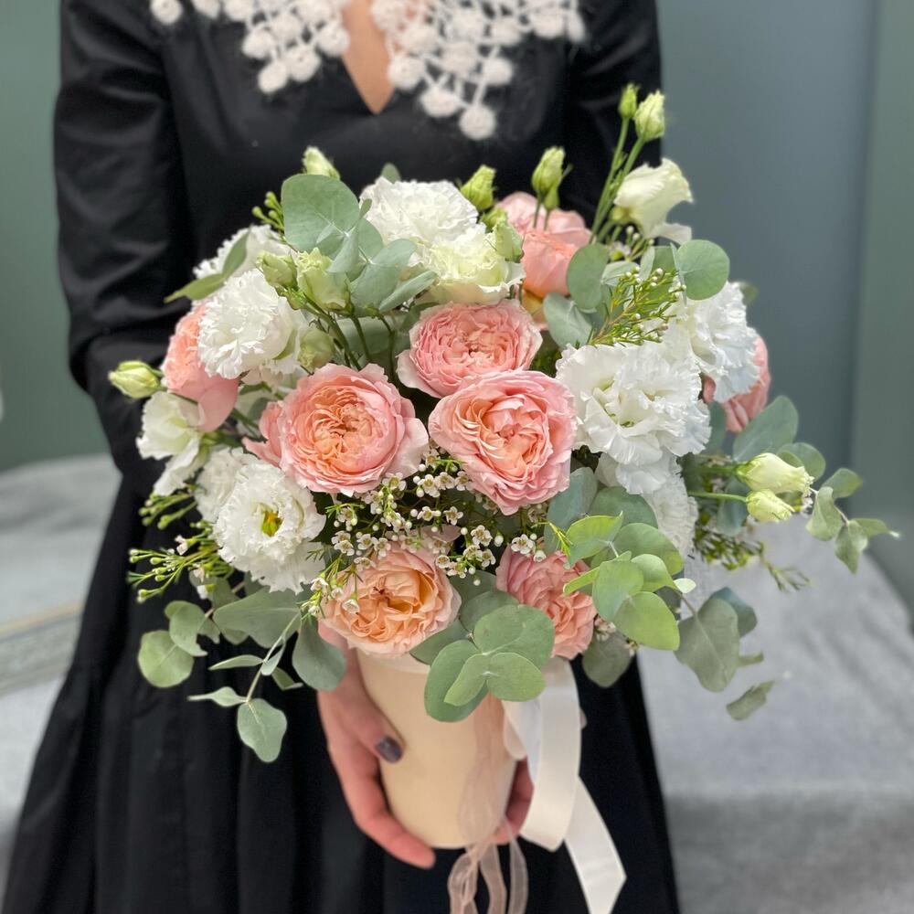Цветочная композиция в коробке с кустовой розой сорта Juliet и лизиантусом. Нежная абрикосово-персиковая роза Juliet никого не оставит равнодушным.* По вашей просьбе, мы подпишем открытку с наилучшими пожеланиями.* Каждый букет цветов (композиция цветов в коробке) упаковывается в прозрачную плёнку и в крафтовый пакет.* Для нежных сортов цветов предусмотрена временная ваза с водой-аквабокс.* К букету прилагается инструкция по уходу и пакетик с подкормкой для продления жизни срезанных цветов в вазе и цветочных композициях на флористической губке.