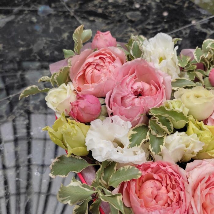 Роза кустовая пионовидная – 2 шт.Питтоспорум – 2 шт.Лизиантус – 3 шт.Коробка сердце – 1 шт.