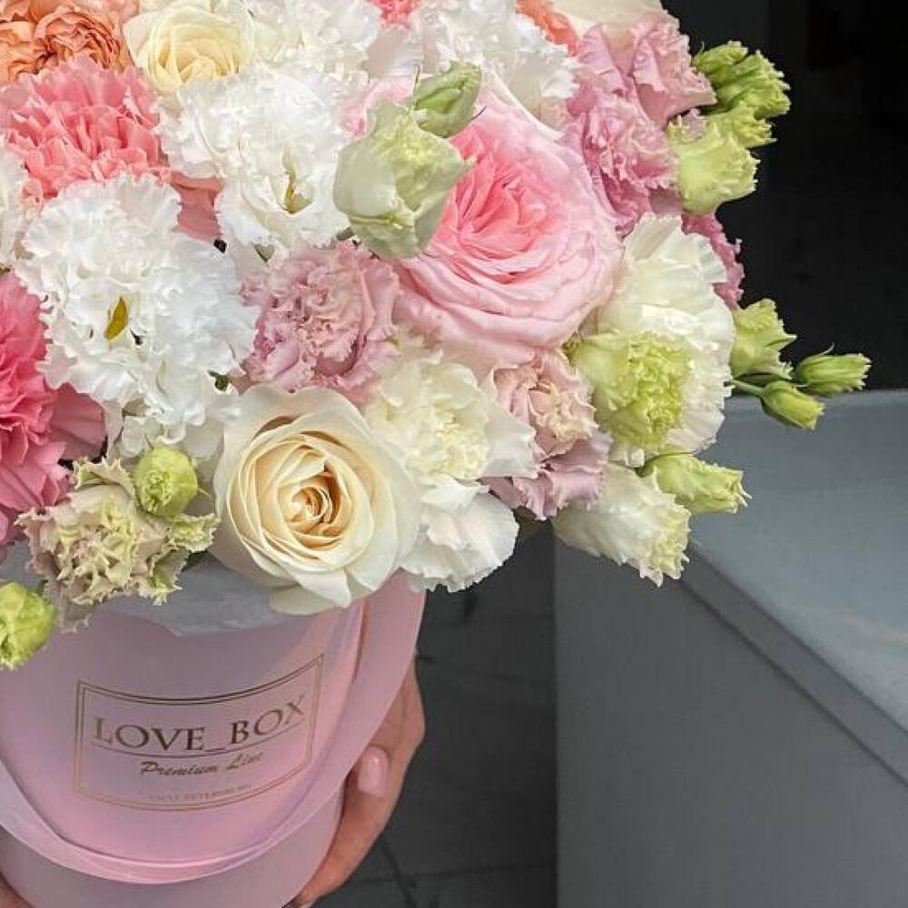 Цветочный микс в шляпной коробке. Цвет коробочки можно выбрать любой из наличия