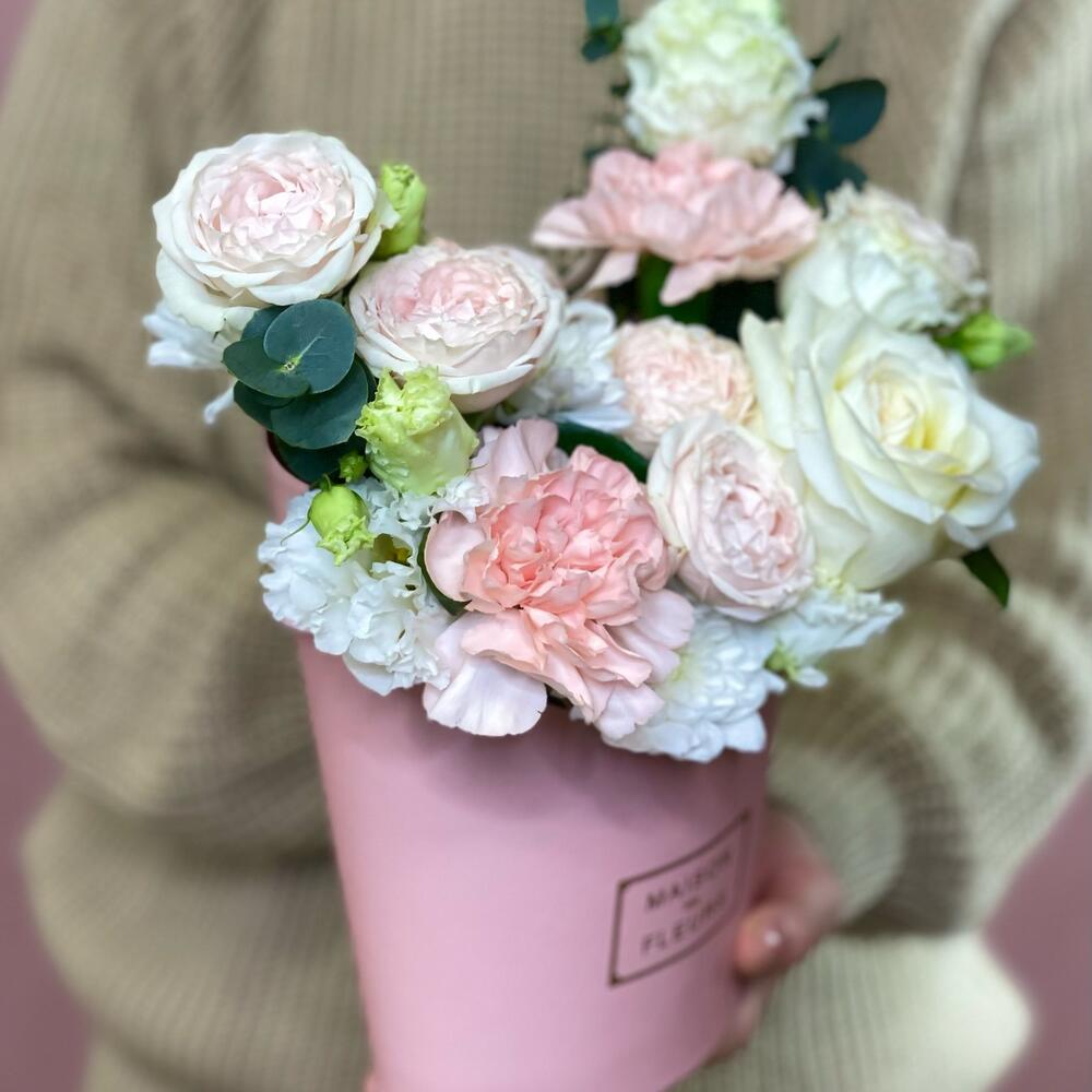 Роза Эквадор – 1 шт.Роза кустовая пионовидная – 1 шт.Гвоздика сортовая – 3 шт.Хризантема кустовая – 1 шт.Лизиантус Алиса белый – 1 шт.зелень декоративная – 1 шт.Коробка – 1 шт.