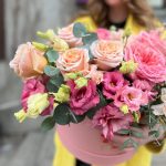 Роза пионовидная – 3 шт.Фисташка – 4 шт.Роза – 6 шт.Диантус кустовой – 3 шт.Диантус – 6 шт.Эвкалипт – 2 шт.Лизиантус – 5 шт.Гениста – 2 шт.Коробка шляпная – 1 шт.Оазис флористический – 2 шт.цветы микс – 10 шт.